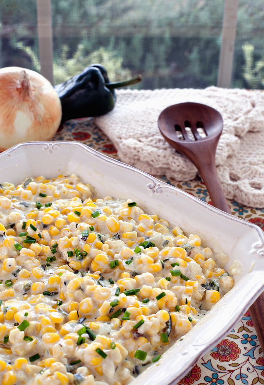 - Fold in chopped poblano peppers, frozen corn, and cheese. Spread the batter into the prepared pan.